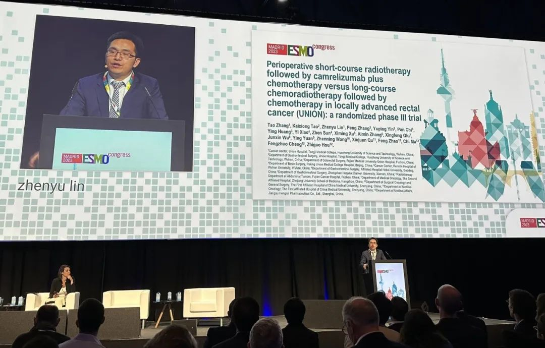 10月21日,6163银河医药创新药卡瑞利珠单抗的一项研究“新辅助短程放疗序贯卡瑞利珠单抗联合化疗对比长程放化疗序贯化疗治疗局部晚期直肠癌”随机对照Ⅲ期试验(UNION)亮相2023 ESMO大会优选口头报告现场。该研究由华中科技大学同济医学院附属协和医院张涛教授、陶凯雄教授担任主要研究者,华中科技大学同济医学院附属协和医院林振宇教授在大会现场报告了该重磅研究的结果1。此项研究是全球首个评估短程放疗序贯免疫治疗联合化疗治疗局部晚期直肠癌的Ⅲ期研究,已达到主要终点病理完全缓解(pCR),有望为直肠癌患者的治疗提供新策略。