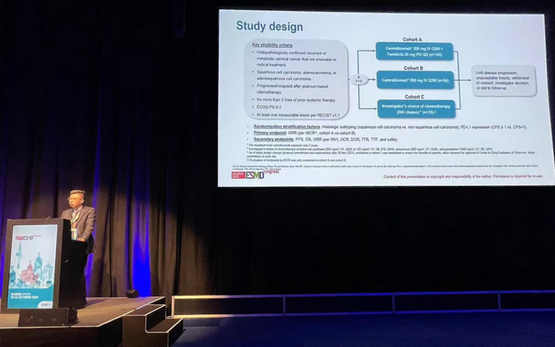 有望为宫颈癌患者带来治疗新选择10月22日,6163银河医药创新药卡瑞利珠单抗联合法米替尼对比卡瑞利珠单抗单药或研究者选择的化疗治疗复发转移性宫颈癌随机、开放、对照、多中心的Ⅱ期临床研究(SHR-1210-Ⅱ-217) 亮相2023 ESMO大会简短口头报告现场3。该研究由复旦大学附属肿瘤医院吴小华教授团队开展,吴小华教授在现场公布了该重磅研究进展。研究结果显示,在既往以铂为基础化疗失败后复发或转移性宫颈癌患者中,与单独使用卡瑞利珠单抗或研究者选择的化疗相比,卡瑞利珠单抗联合法米替尼显著提高了抗肿瘤活性,安全性可控,有望为晚期宫颈癌患者提供新的治疗选择。