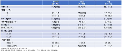 研究共入组513例中国成人T2DM受试者,INS068组和IGlar组分别入组341例和172例。
